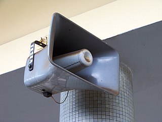 English: A public address horn speaker in a train station in Smíchov, Prague, the Czech Republic. This type of speaker, called a reflex or reentrant horn, or bullhorn, is a type of horn loudspeaker. Horns are widely used as speakers in public address systems because they are more efficient, typically able to produce 10 times the sound energy of cone speakers from a given amplifier output. In this type of speaker, a small metal diaphragm is vibrated by an attached coil of wire in a magnetic field, creating sound waves, which are conducted to the outside air through a flaring acoustic horn duct. Since the horn must be several feet long, to make it more compact the sound path is "folded" into a zigzag pattern, with the sound passing through a narrow central duct to a concentric backward duct, and then out through the flaring outer horn. Bullhorns have very poor frequency response, typically from 300-400 Hz to 5 kHz. However this can actually be an advantage in public address systems, since it matches the frequency distribution of the human voice, any background noise outside this bandwidth is attenuated.